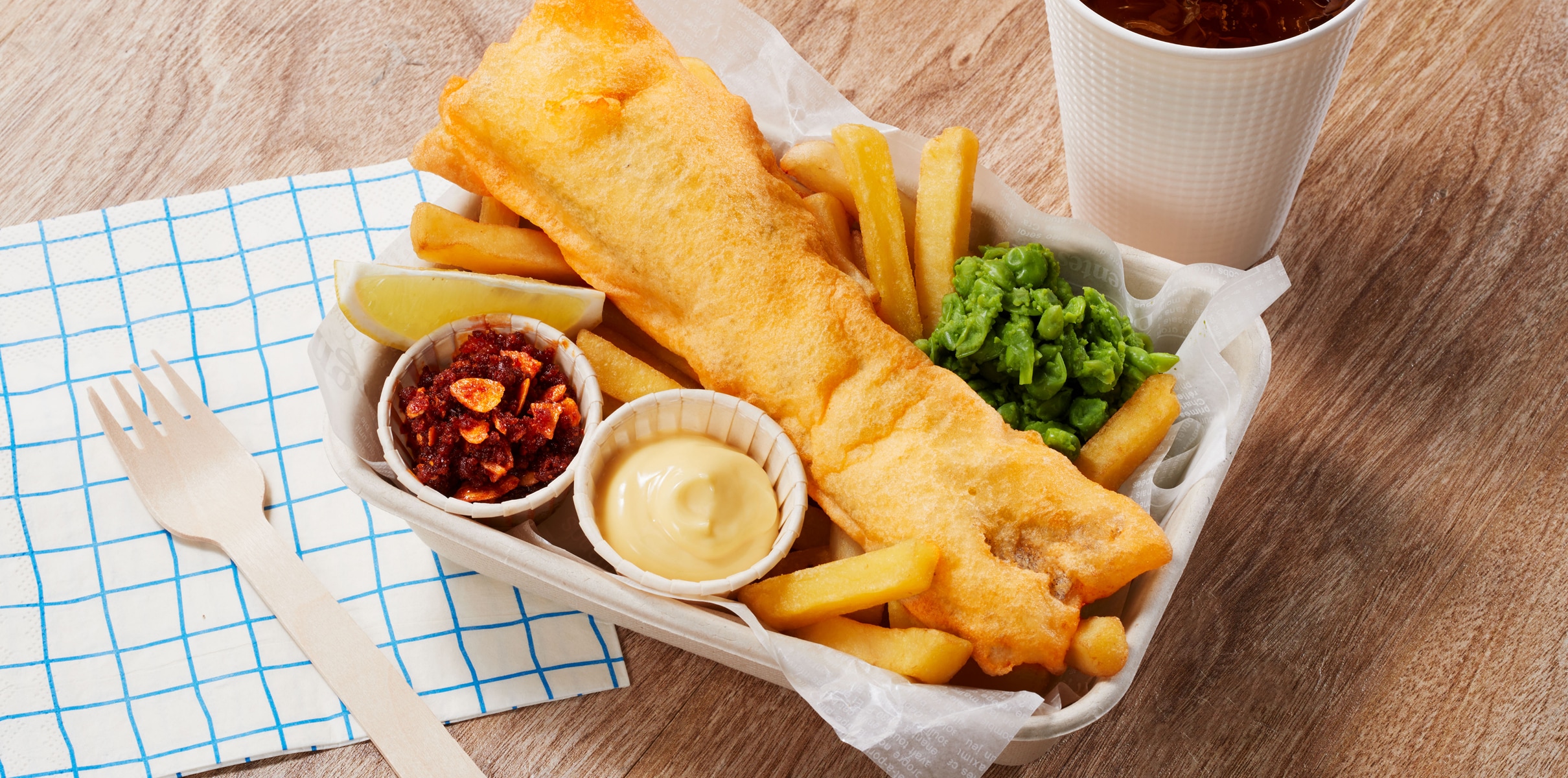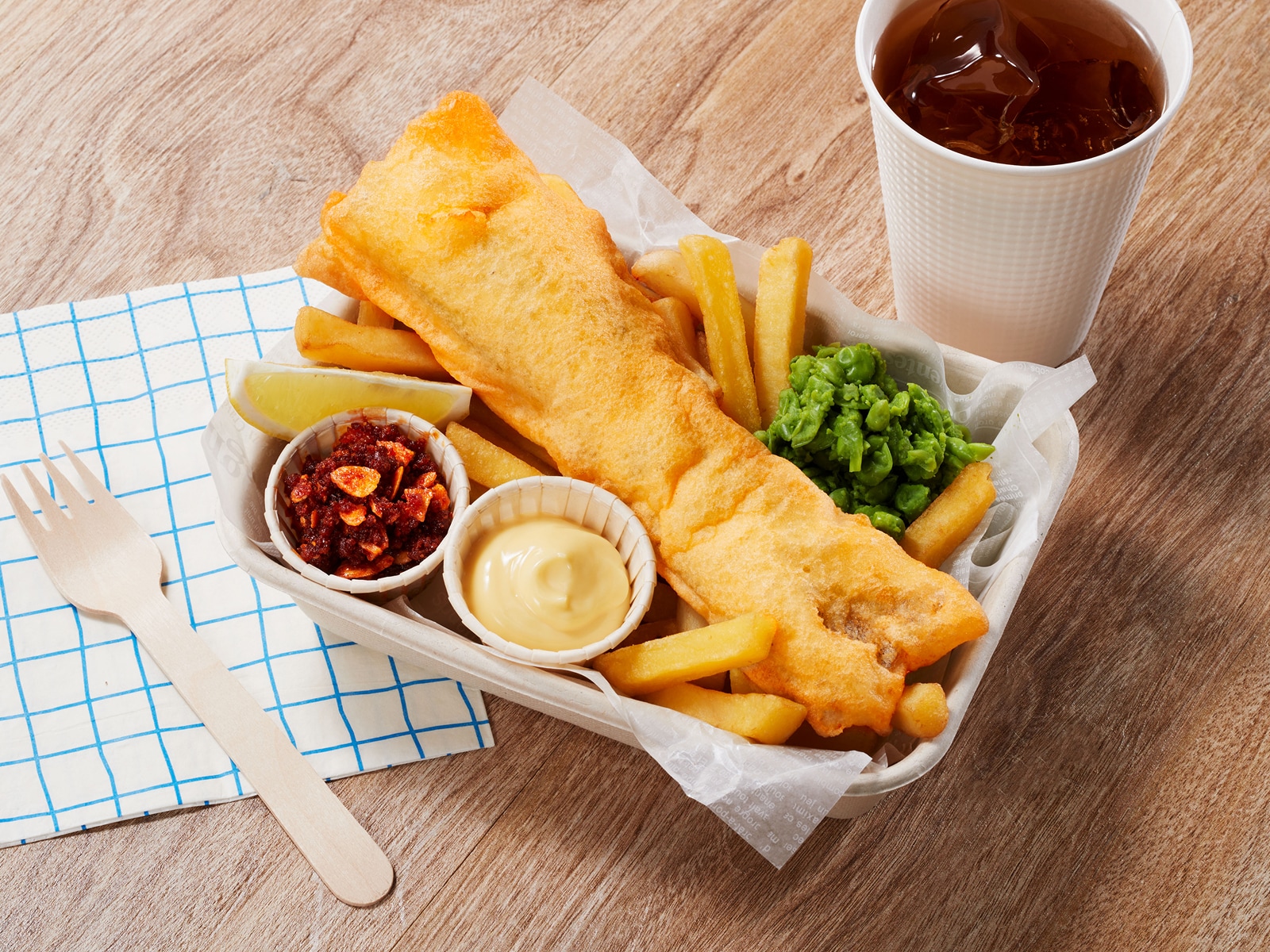 Dust the cod with flour, coat with batter [3], and fry in oil at 160-170°C.