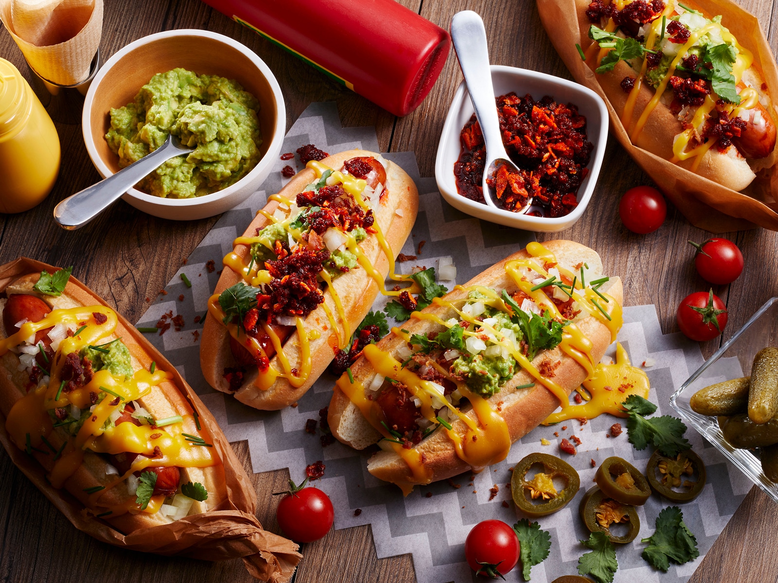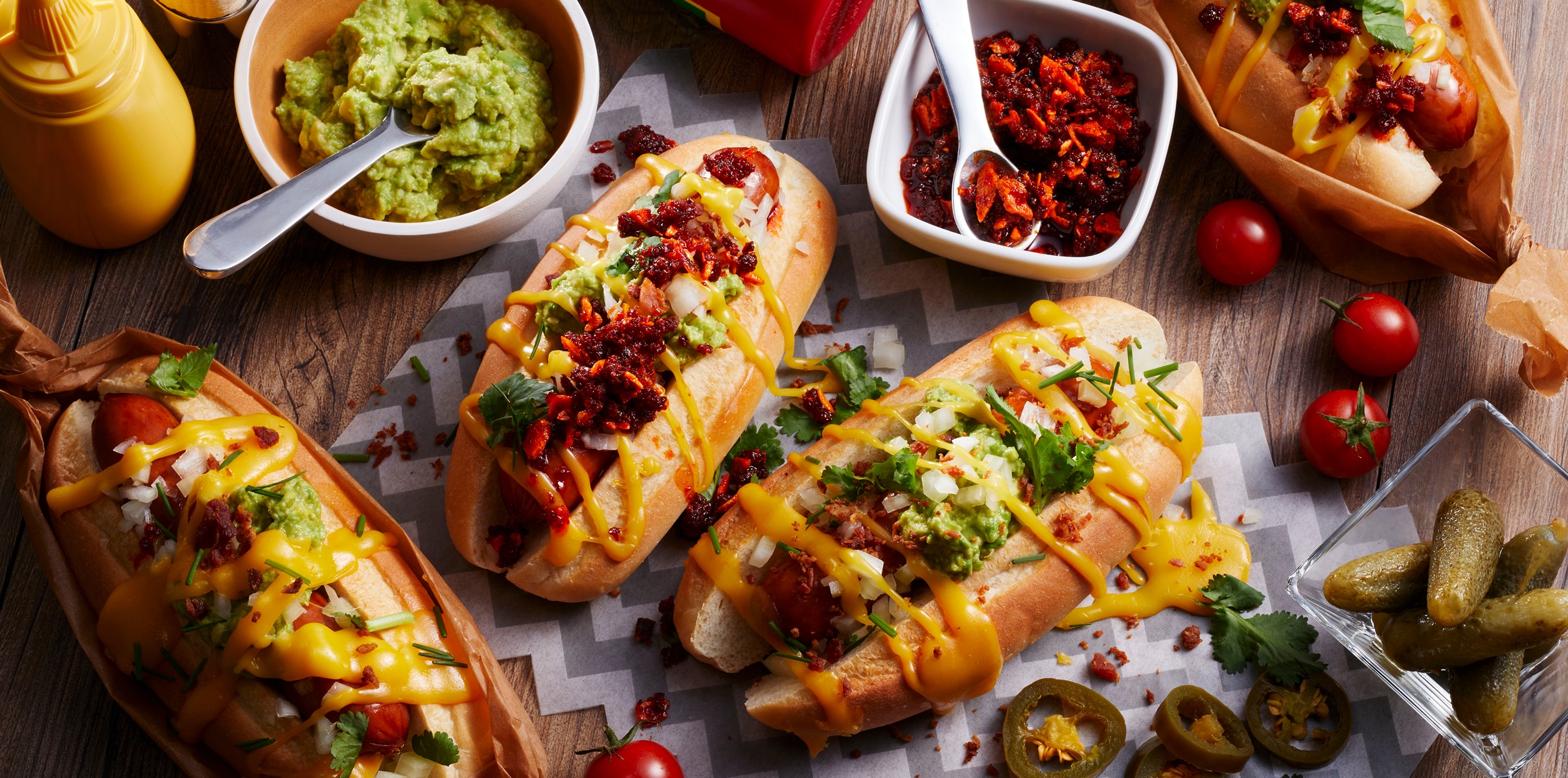 Top the dish with bacon bits, cilantro, chives, chopped onions, and jalapeño pepper as