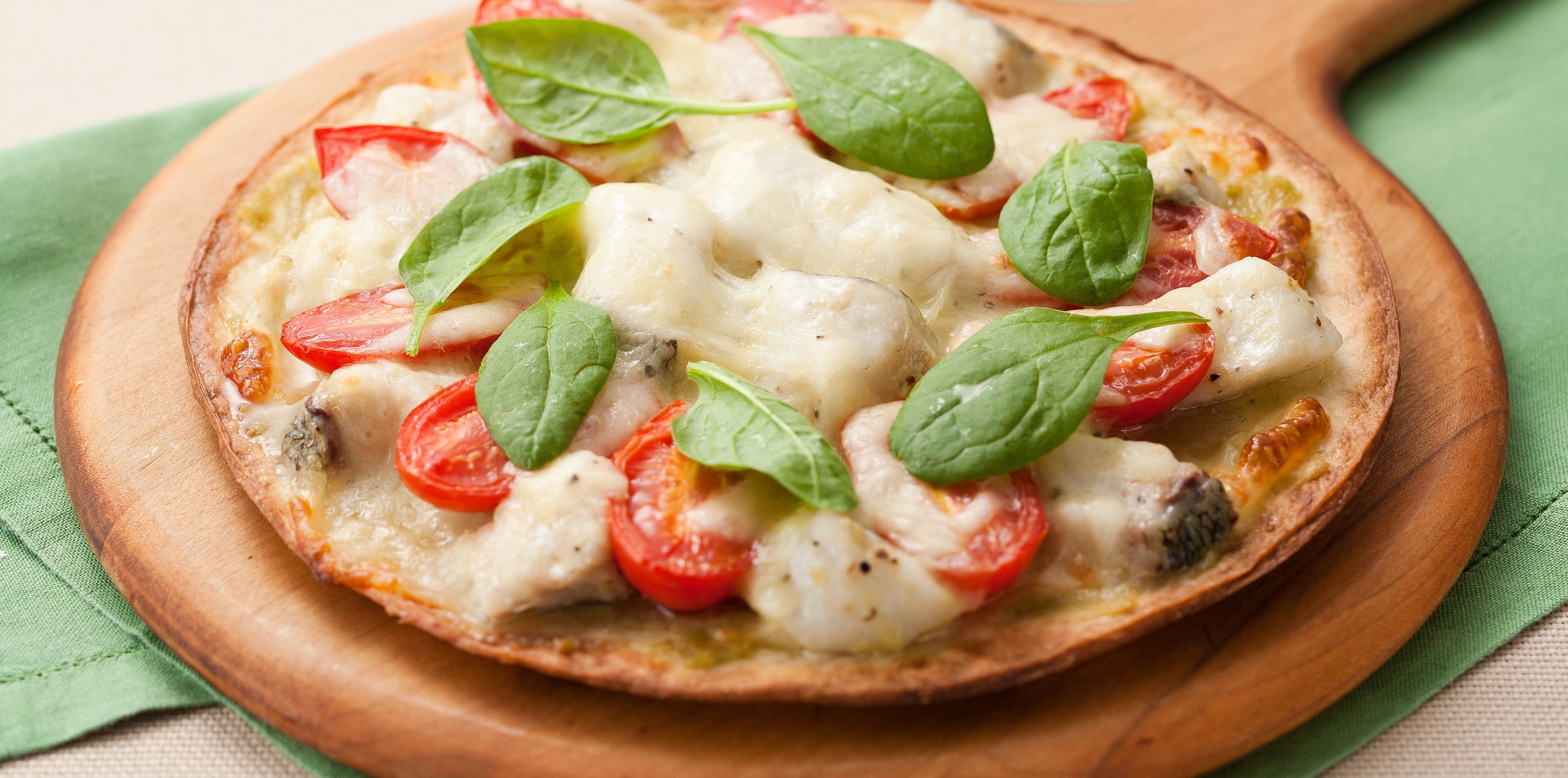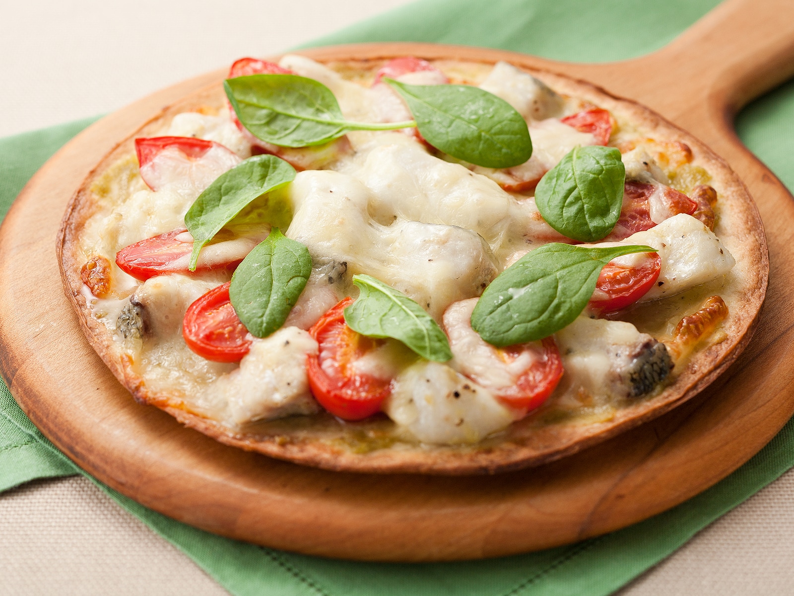 Spread wasabi over the pizza crust, arrange the cod and tomatoes on top, then cover with mozzarella cheese.
