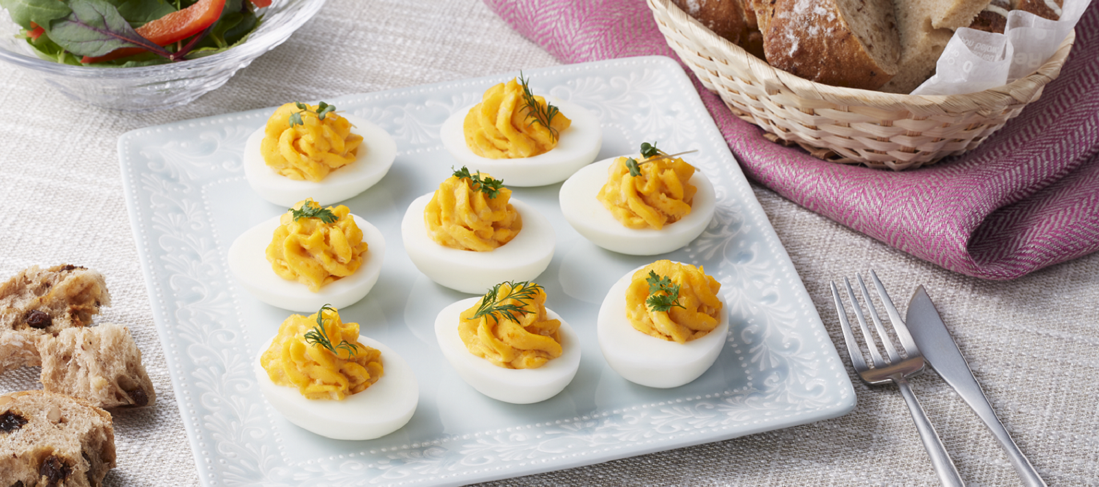 세로로 반을 잘라 노른자를 볼에 담고 포크로 매끄러운 상태가 될 때까지 으깬다.