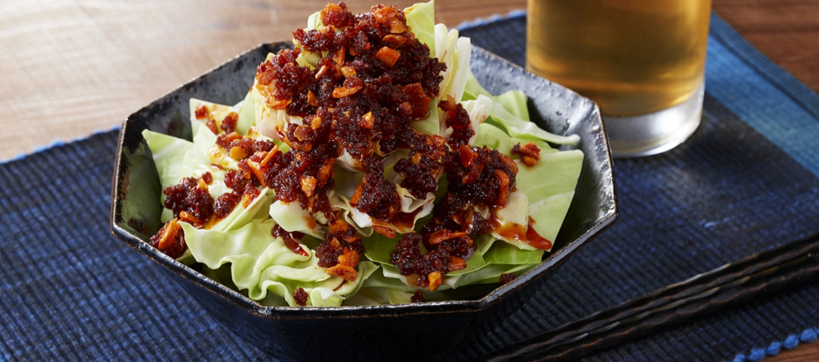 그릇에 양배추를 담고 S&B UMAMI TOPPING Crunchy Garlic (오카즈라유)를 충분히 뿌립니다.