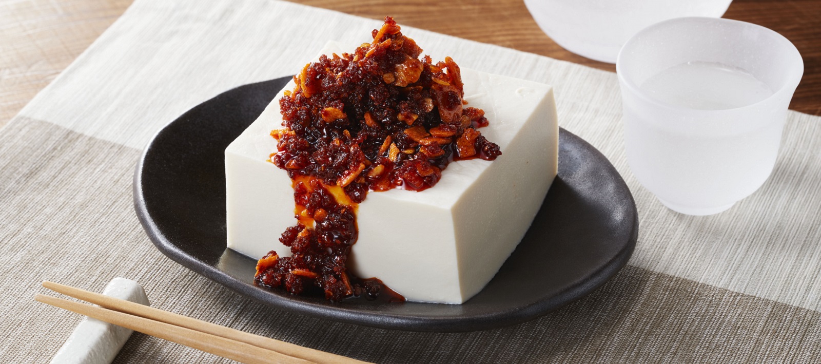 두부 위에 S&B UMAMI TOPPING Crunchy Garlic (오카즈라유)를 뿌립니다.