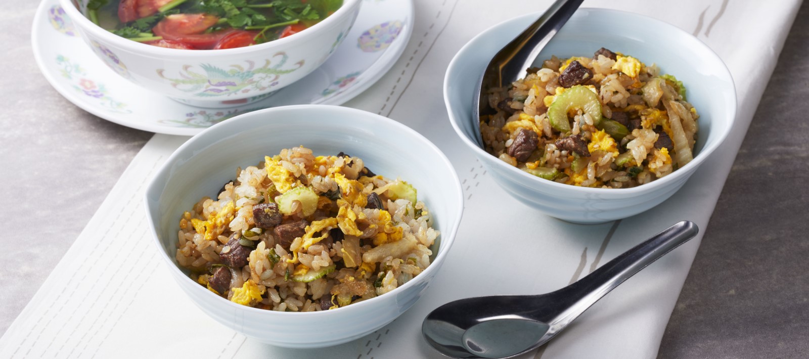 - 【3】의 팬에 샐러드유 1큰술을 넣고 중불로 가열한 후 【1】을 볶는다. 셀러리의 물기가 빠지면 따뜻한 밥을 넣은 후 전체적으로 보슬보슬해지면 【3】을 다시 넣고 재빨리 섞는다.