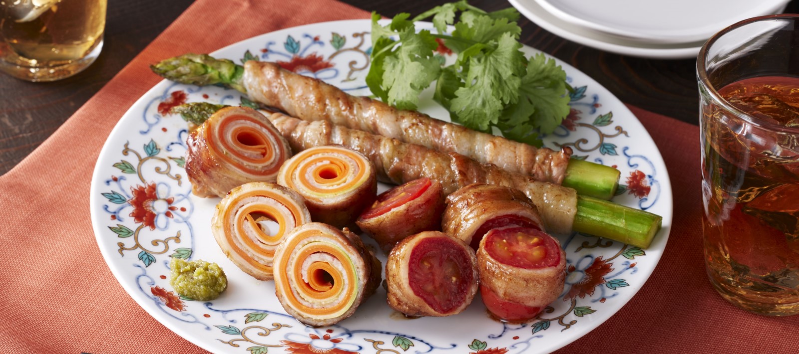 - 고기말이를 만든다. ①【2】에서 【1】의 토마토 고기말이를 만든다. ②【2】에서 【1】의 아스파라거스 고기말이를 만든다. ③【1】의 쥬키니호박과 당근을 2장씩 겹친 후 【2】의 돼지고기와 겹친 다음 동그랗게 말아준다.