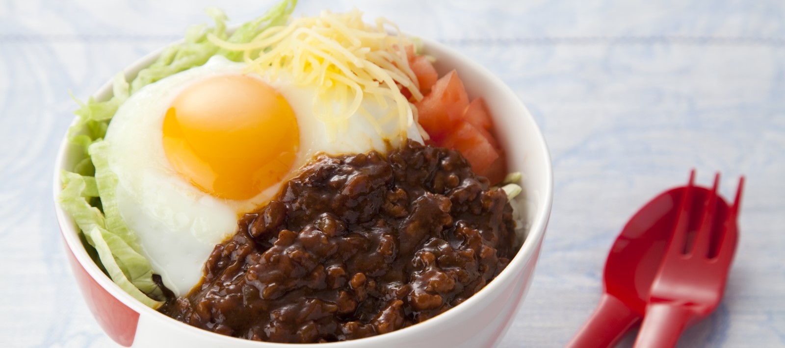 - 그릇에 하얀 쌀밥을 넣고 양상추, 계란 후라이를 얹고 【3】을 얹어, 토마토와 잘게 썬 치즈를 장식합니다.