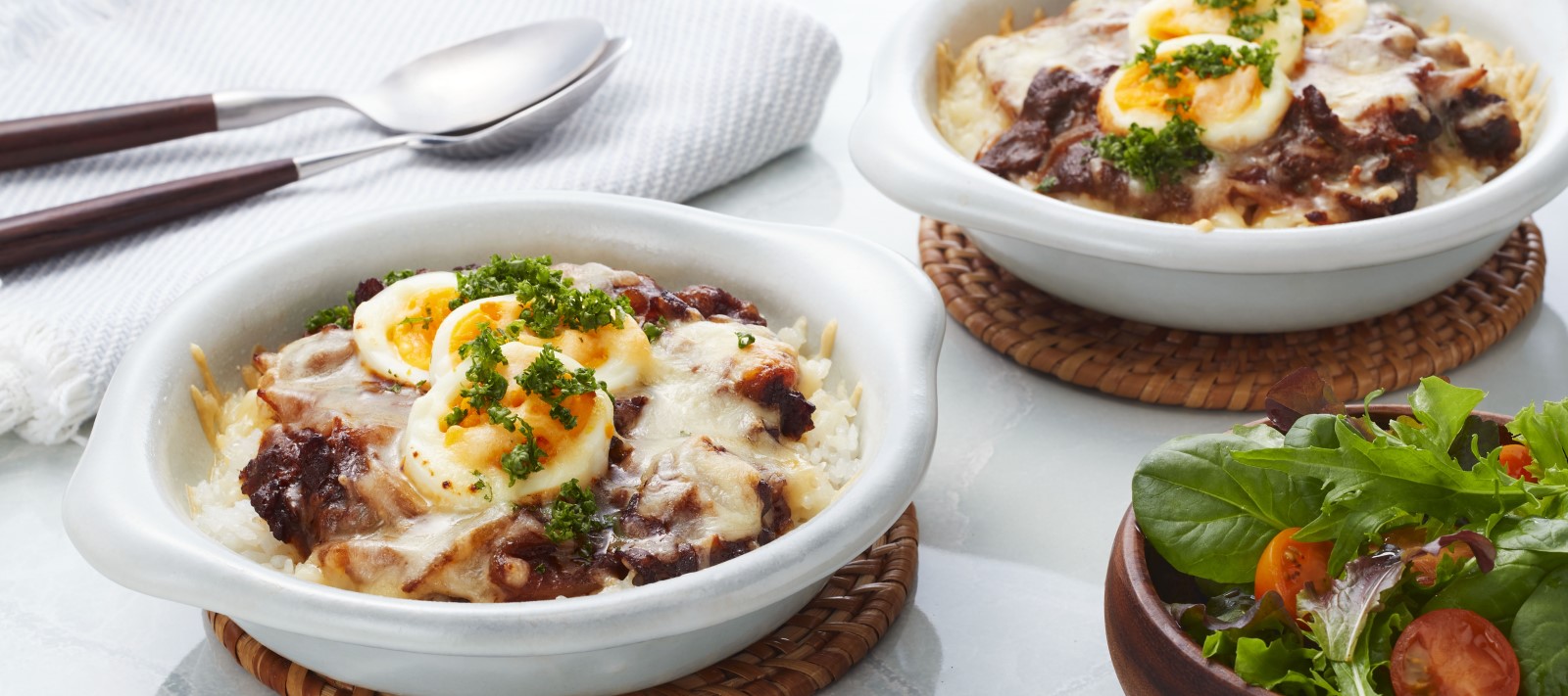 【3】의 하이라이스 소스를 얹고 삶은 계란(슬라이스)를 얹고 치즈를 뿌려200 ℃의 오븐으로 12,13분 표면이 알맞게 구워질 때 까지 굽습니다.