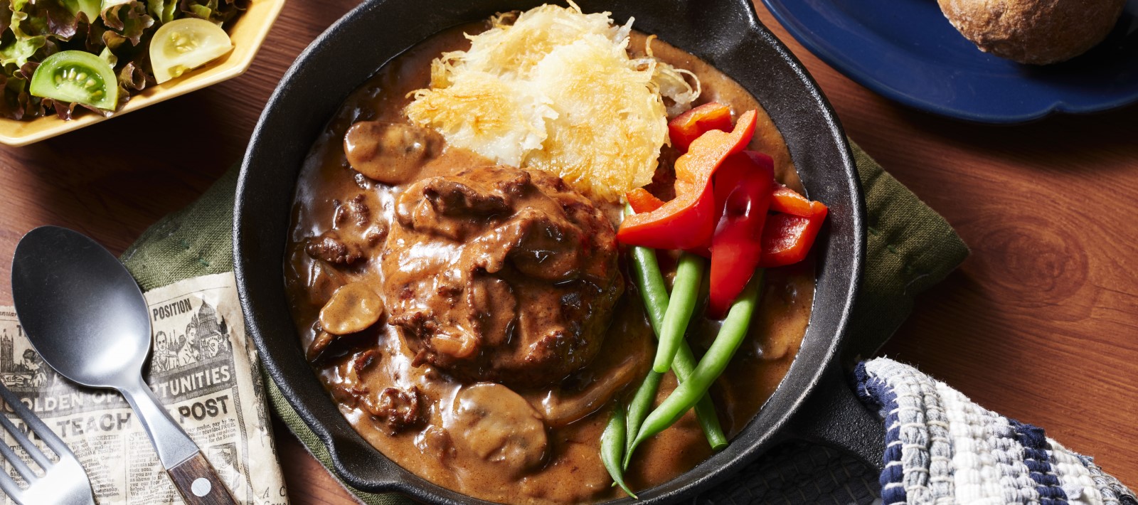 - 표면을 구운 햄버그를 넣고 소스가 끓으면 약불로 한다. 뚜껑을 덮고 타지 않게 상황을 보면서 10분 끓인다.