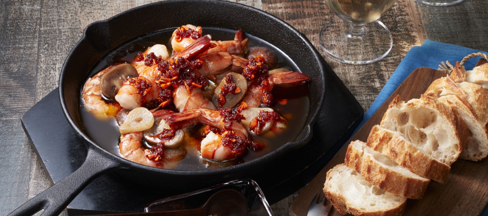 - 오일을 두른 팬에 마늘을 넣고 향이 오르기 시작하면 양송이버섯, 새우를 넣고 끓여줍니다.