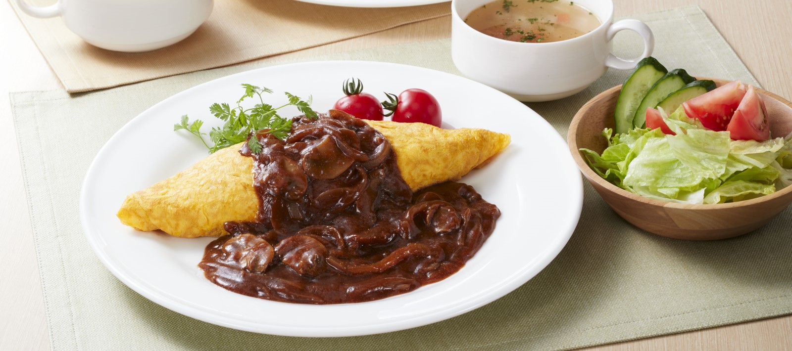 밥을 감싸듯이 양쪽 면에서 구워진 달걀을 덮고 모양을 잡는다.