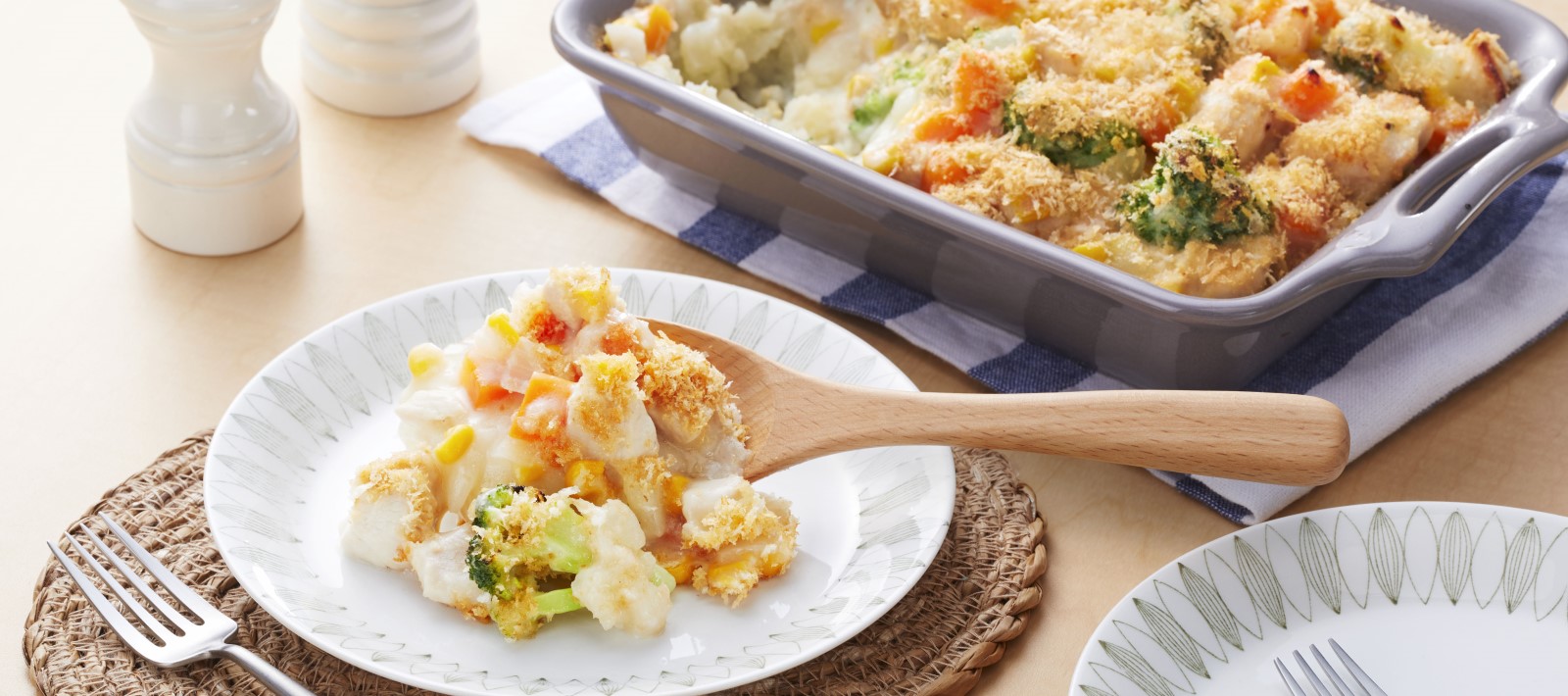 당근이 부드러워지기 시작하면 불을 끄고 루를 쪼개 넣어 녹인다. 다시 중불로 한 후 우유를 넣고 한소끔 끓인 후 옥수수와 브로콜리를 넣어 섞는다. - 그라탕 접시(내열 접시)에 기름(적당량)을 바르고
