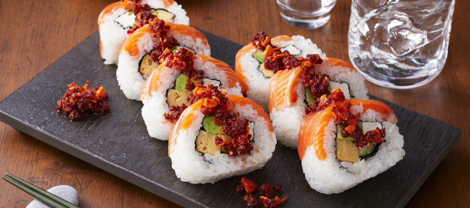 - 김밥발, 랩을 벗기고 자릅니다. UMAMI TOPPING을 뿌려 완성입니다.