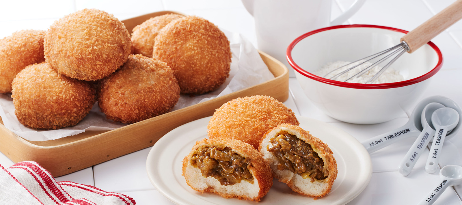 Put 30g or curry filling in the center. Wrap it up by pinching the dough around it and folding it in. Shape the rolls. - Bread each roll with water and panko breadcrumbs. Place them seam-side down and let rise at 30°C for 20 minutes.