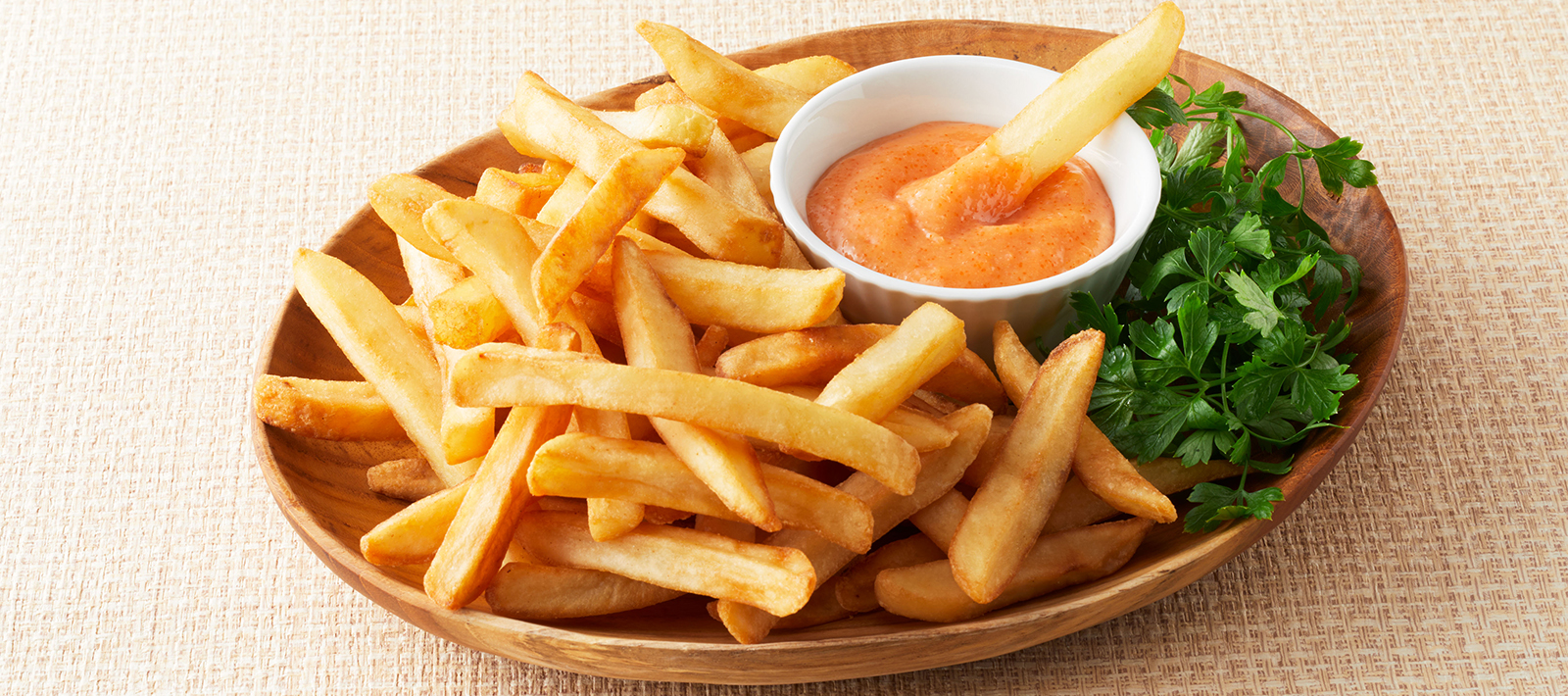 The recipe recommends a mixture with equal ratio, but this can be adjusted to your preference. - Serve the Mentai-Mayo Sauce as dip for the French fries.