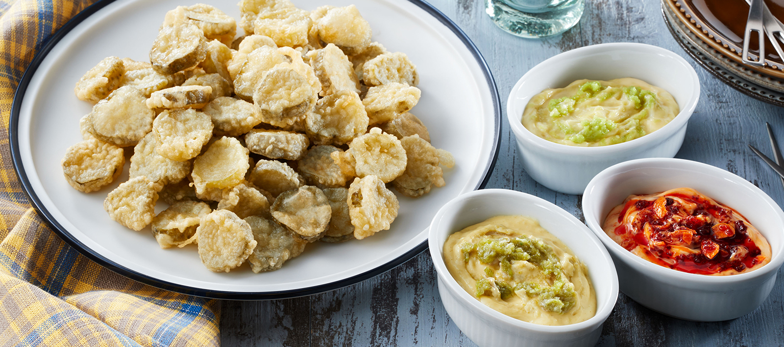 - Lightly coat [1] with flour, batter [2], and fry until lightly browned.