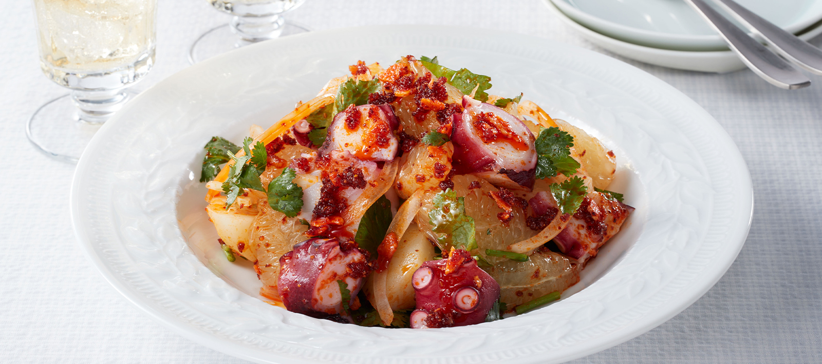 Chop the cilantro into small pieces. - Put [1] in a mixing bowl and mix with the white wine vinegar and then, UMAMI TOPPING.