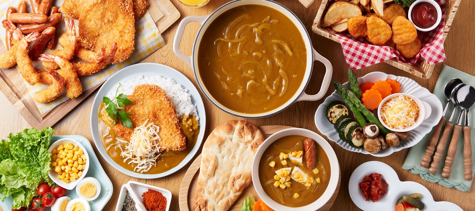 Chicken katsu, Tonkatsu, deep-fried prawns, sausages, chicken nuggets, potatoes, boiled eggs, corn, cherry tomatoes, lettuce, grilled vegetables, cheese, Fukujinzuke, pickles, pickled scallion, etc. |
