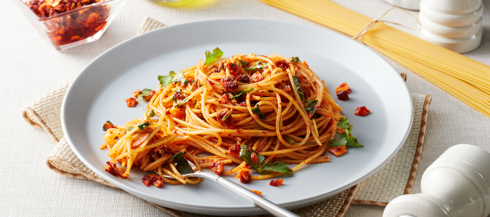 Once hot, add the cooked spaghetti and mix to coat with the S&B UMAMI TOPPING. - Turn off the heat, season with salt, and add chopped coriander to taste.