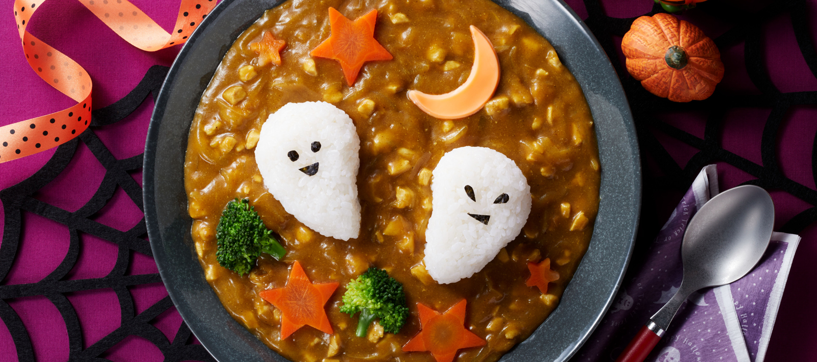 Mold the rice into ghost shapes, create faces using the nori seaweed, and place in a bowl. Pour over the curry from step [1] and top with [2].