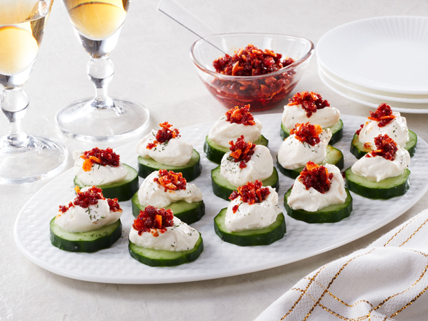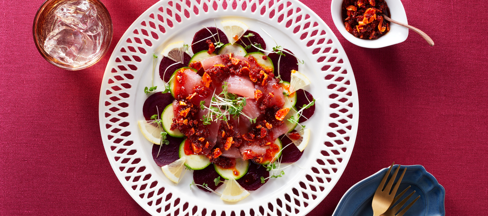 - Thinly slice the tuna and cut the zucchini into thin rings.