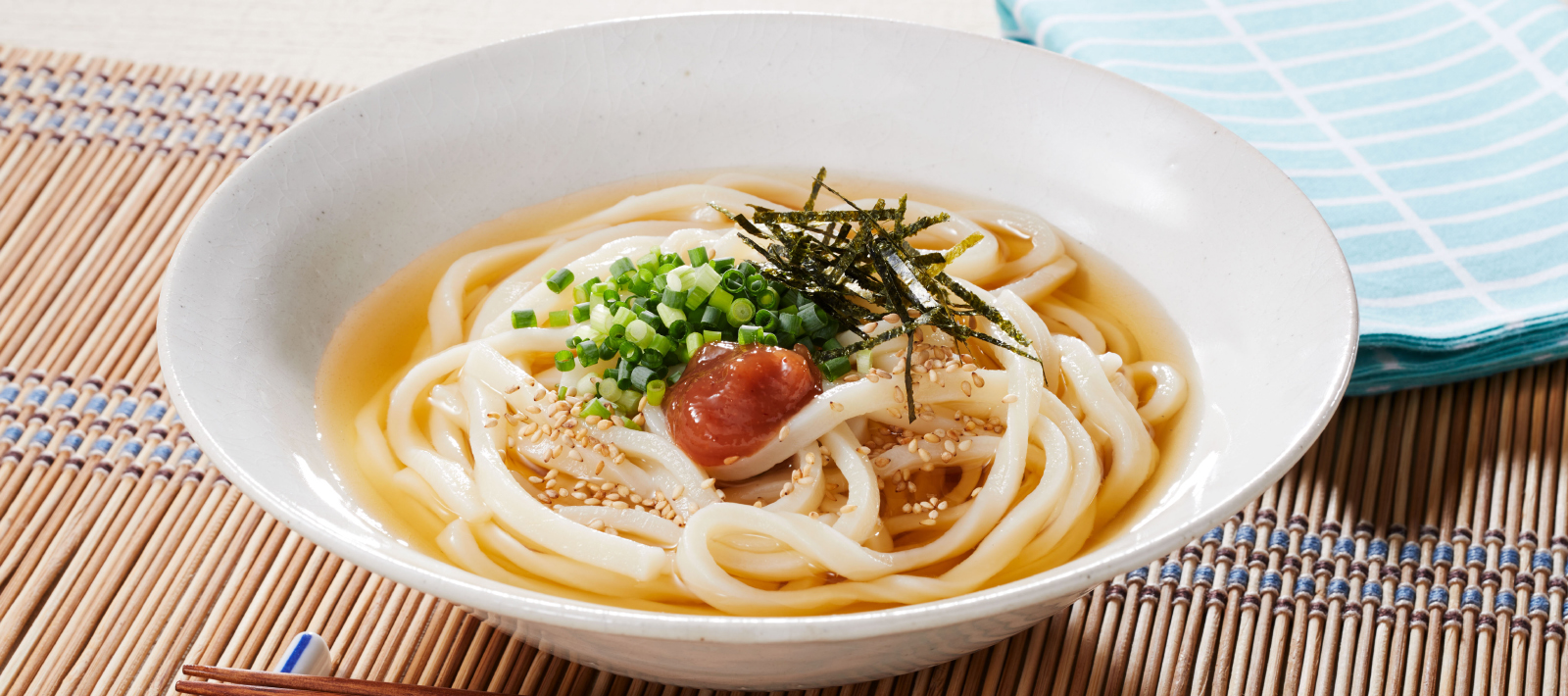 - Serve the udon noodles in bowls and top them with UMEBOSHI PASTE, chopped seaweed sheet, green onion, and sesame seeds, and pour [2] over them.