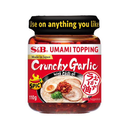 植物油 (葵花油、麻油)、紅辣椒 (12%)、炸蒜蓉 (11.5%)(大蒜、棕櫚油)、調味劑(L-麩酸鈉、5’-鳥嘌呤核苷磷酸二鈉、5’-次黃嘌呤核苷磷酸二鈉)、洋蔥粉、食鹽、砂糖、辣醬(2.6%)(紅辣椒、食鹽、米)、醬油粉(醬油[脫脂大豆、小麥、食鹽、大豆]、糊精、食鹽)、研磨芝麻、抗氧化劑(α-生育酚)
