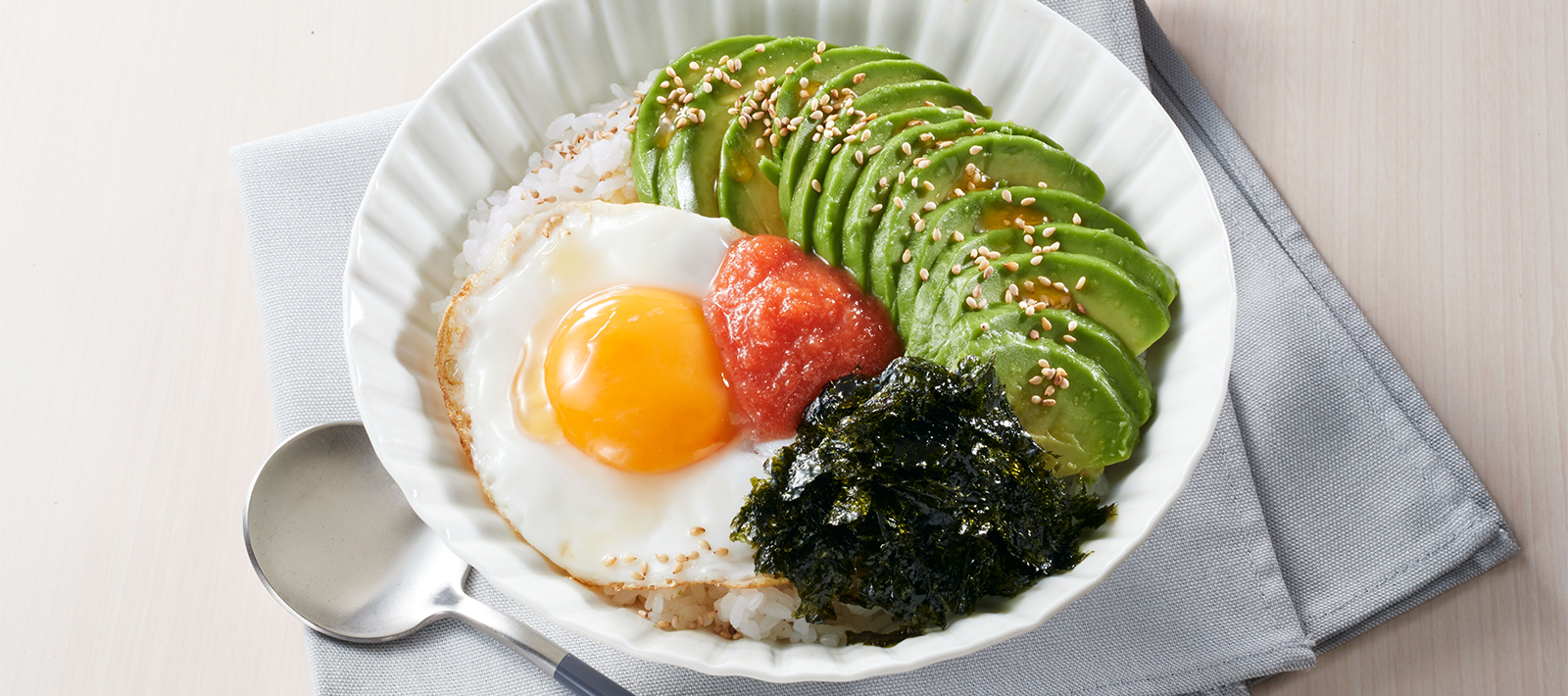 - Put rice in a bowl and top it with avocado, sunny-side up fried egg, S&B MENTAIKO PASTE, and seaweed sheet.