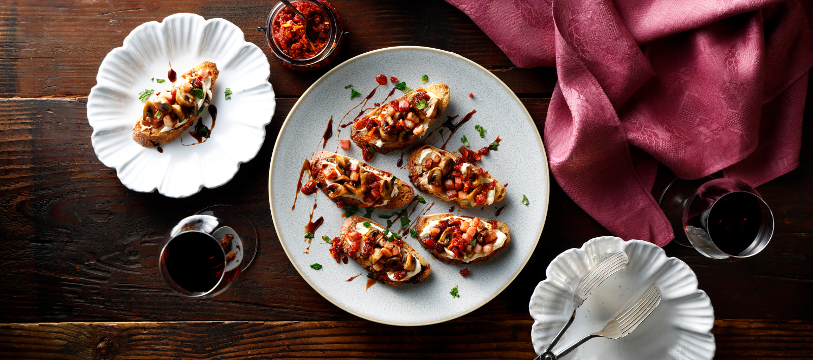 Sprinkle some salt to flavor. - Lightly toast the baguette slices and spread cream cheese on them. Put [3], [1], and S&B UMAMI TOPPING on the baguette slices and garnish with parsley.